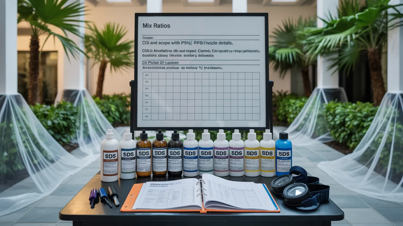 Systematize chemical handling: label containers, follow SDS, mix in ventilated areas, and use dedicated measuring tools to prevent cross-contamination. Control overspray and runoff; plug exterior outlets and cover landscaping. Establish drop zones under work areas and secure tools with lanyards. Tailboard briefings before job start, lockout of pressure systems during maintenance, and post-job inspections close the loop on safety.